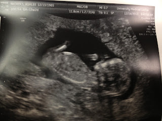 - Best Moment of the Week: Getting to see Baby!!! We had the NT Scan and baby was standing on its head the whole time so they didn’t even get to do the testing. But, we got to see baby and he/she is so healthy! BPM was 147 and growth is right on track. He/she even waved for us! Sweet little thing! I had a good birthday, too! 🙂 27 is looking pretty good!