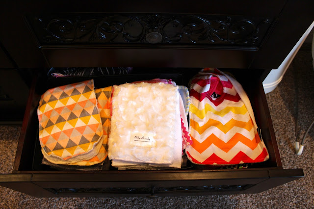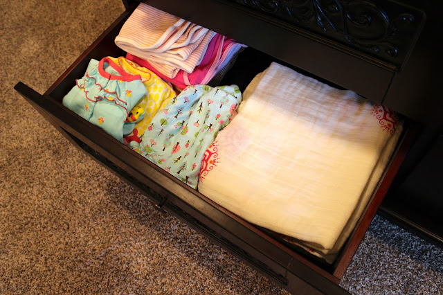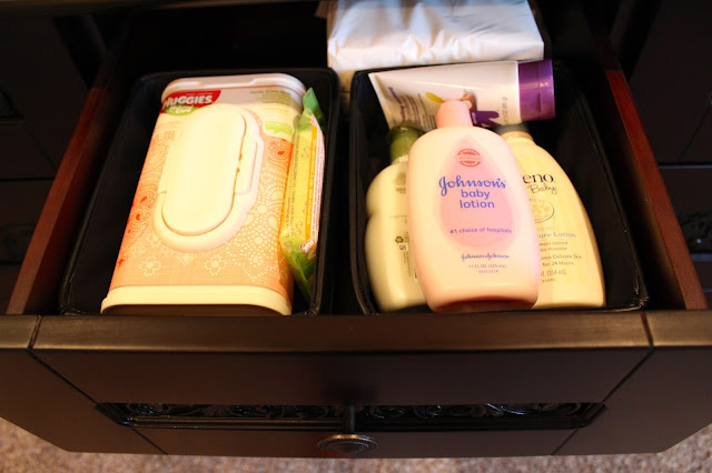 Since Laikyn’s closet is small, I wanted to spread out her clothes between the dresser/changing table we got her and the closet. Her dresser will store diapers, wipes, lotions, nursing supplies, clothes, blankets, etc. It has been so helpful to get baskets to organize the insides of each drawer. Here is how I did it: