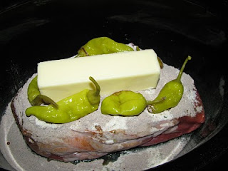 Make sure the roast is thawed and not frozen. Put roast in a slow cooker, i.e. crockpot. Sprinkle Ranch packet over the roast and rub it in, flip the roast to the other side and repeat. Sprinkle Au Jus packet in crock pot. Put stick of butter on top and put in 5 peppers. Cook on low heat for 6-8 hours.