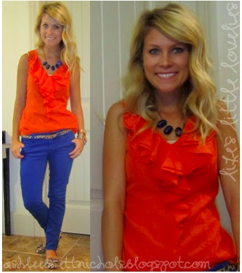 I was feeling a little color-blockin’ again! This time–I went bold! Tangerine is a hot color! I paired it with some cobalt skinnys and leopard accents. Yes, you spy my painted DIY necklace! 🙂 I love it and get so many compliments on it! Can’t believe I painted a necklace with finger nail polish? Read the blog post about it here.