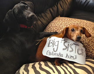 Tuck already loves pesters his much smaller, big sister, Hydie who is a 12-year-old (very fat) Miniature Dachshund. She just loves tolerates him.