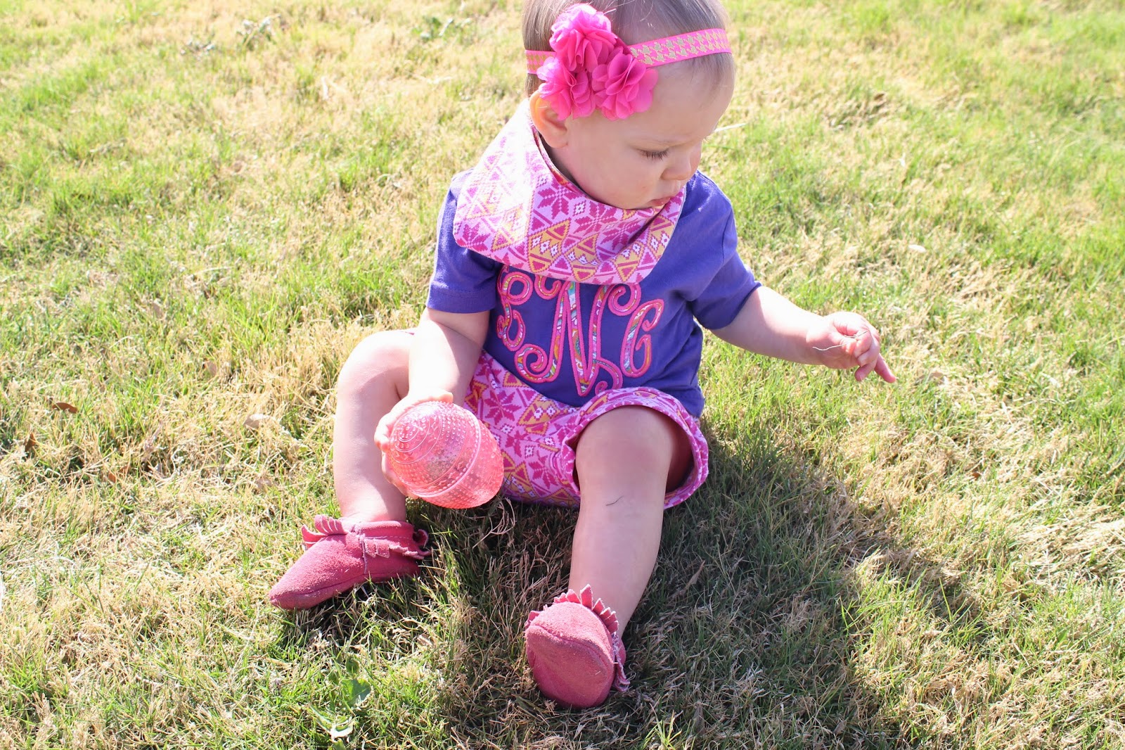 Little Lovelies Headband // Babyface Boutique Harem Shorts & Bibdana // Chaney & Co Monogramed shirt // Freshly Picked moccs