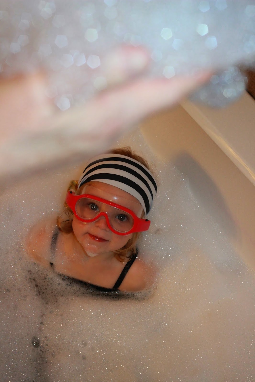 We play. We have fun. We act like we’re at the beach. We pretend it’s hot outside and we’re swimming in a sea of salt water. But it’s cold, snowing, and really bubbles. Girls can dream, right?